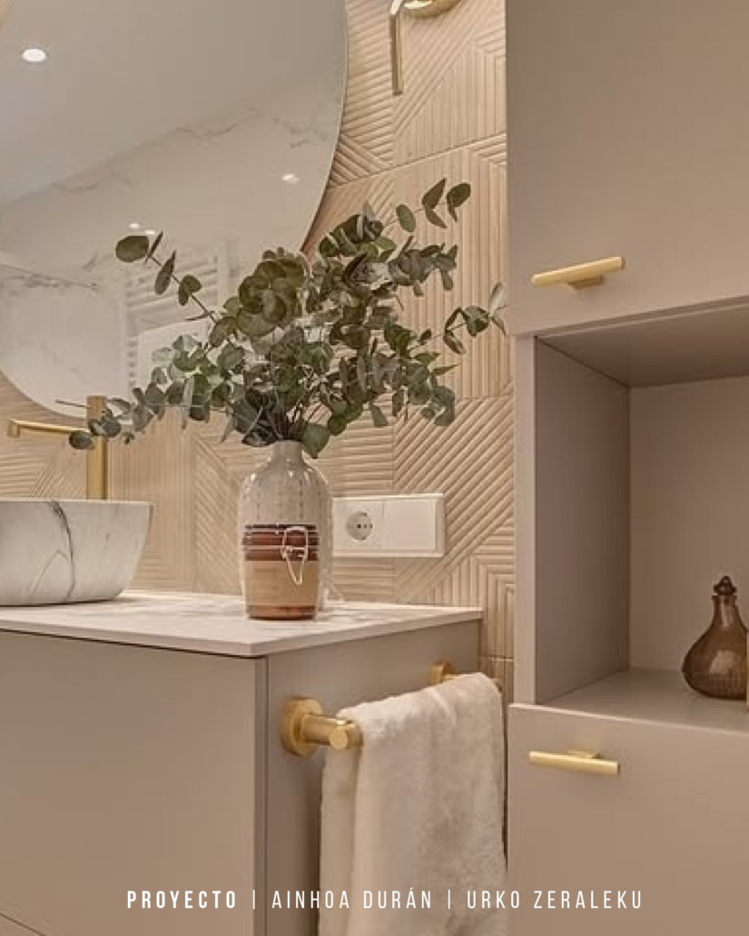 El mueble suspendido U3 de Unibaño con gran capacidad de almacenamiento y el lavabo Teide sobre encimera lisa ofrecen confort y orden. Los acabados dorados mate de la grifería, tiradores y toallero aportan elegancia sin recargar el espacio.