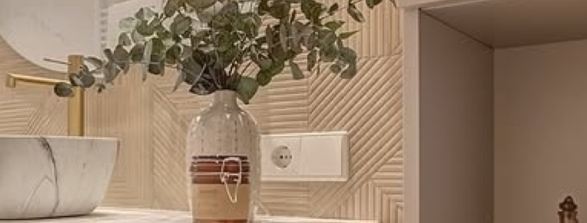 La cerámica texturizada da profundidad visual, mientras que el porcelánico efecto mármol blanco y la luz natural mantienen la luminosidad y la serenidad. La ducha, con mampara sin perfiles y ventana alta, combina discreción y privacidad. Un baño atemporal, sofisticado y funcional para disfrutar cada día.
