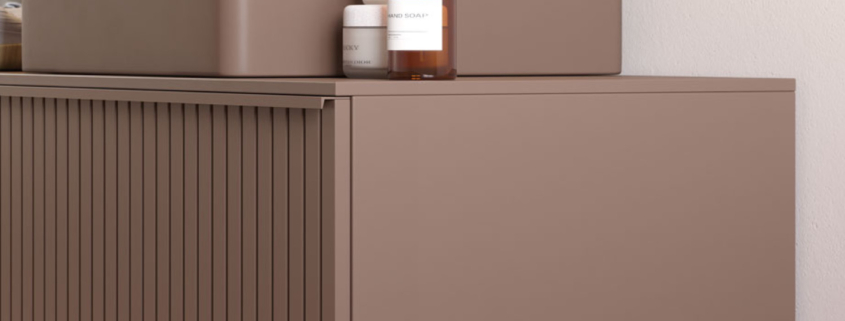 líneas de 2 cm con separación de 5 mm que generan textura visual y ritmo en el mueble. Esta solución aporta carácter al frontal del mueble de baño sin renunciar a la elegancia.