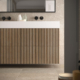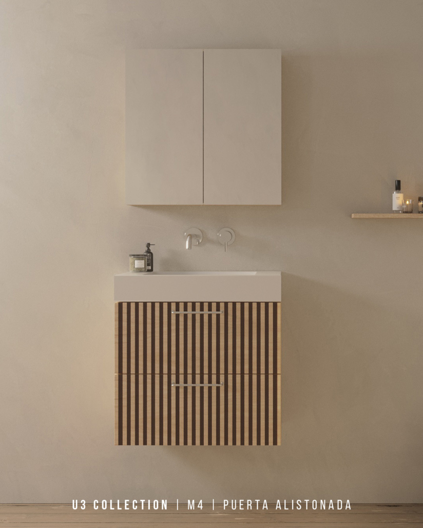 La puerta M4, o «puerta alistonada», es una de las opciones más expresivas de la U3 en acabado madera. Con un diseño profundo y elegante, aporta carácter al mueble y al baño en general. Es perfecta si buscas un punto de atención visual que combine tradición y modernidad en una sola pieza.