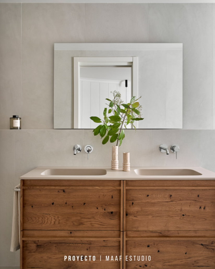 no debe ser un espacio encajado “donde cabe”, sino concebido desde el inicio como una estancia clave de la vivienda. Los materiales y elementos deben generar bienestar y, además, ofrecer comodidad en el uso diario en términos de limpieza y mantenimiento. Esta filosofía se ha aplicado con éxito en la elección de muebles de Unibaño para todos los baños del proyecto.