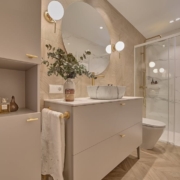 Gracias a la versatilidad de fabricación de Unibaño, se ha conseguido crear un conjunto de muebles funcionales y elegantes que responden tanto a las exigencias prácticas del día a día como al carácter visual definido para el espacio. El resultado es un mobiliario totalmente adaptado, con una distribución pensada al milímetro para optimizar el almacenaje sin interferir en la circulación y el uso del espacio.
