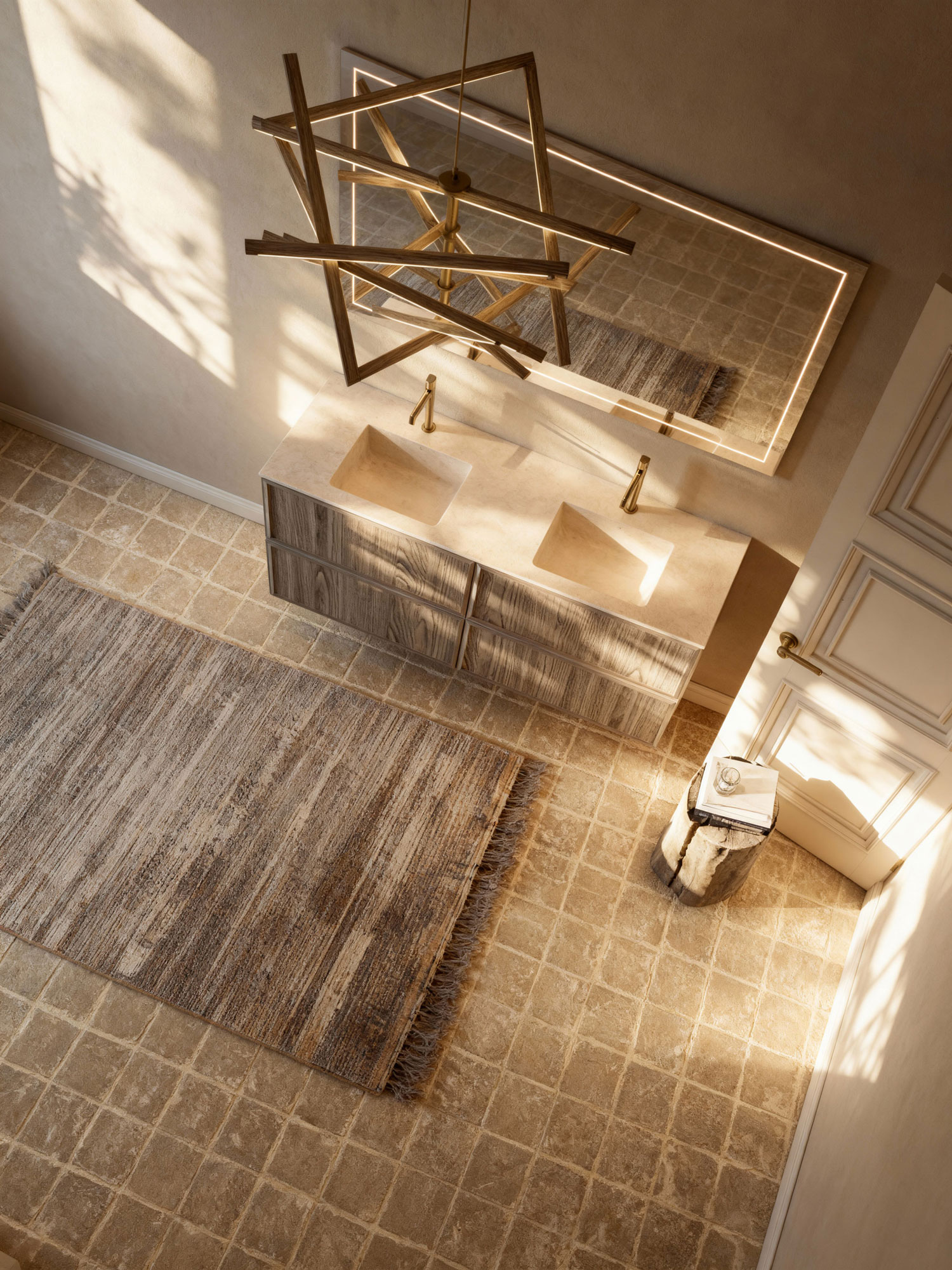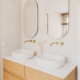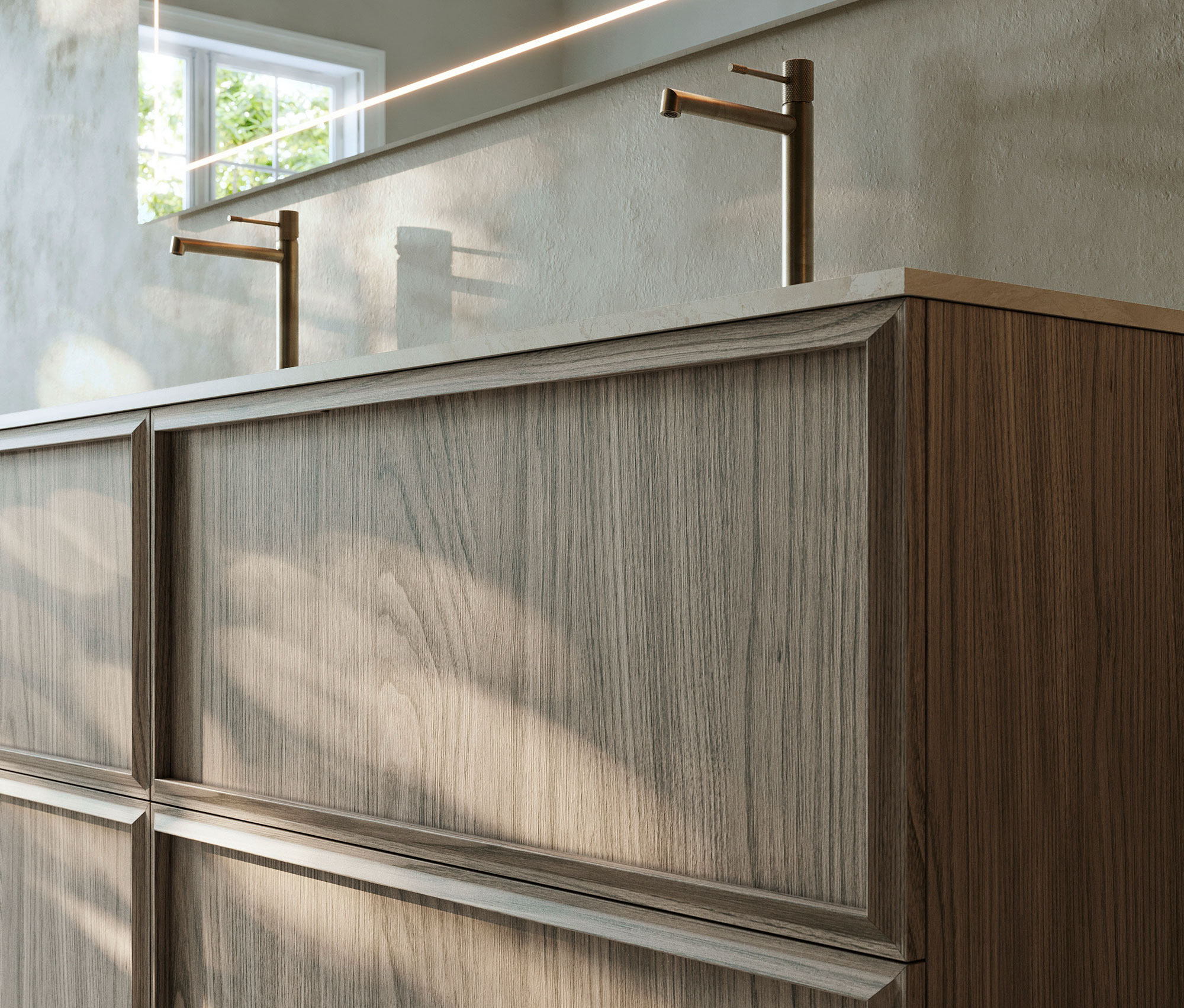 En el baño contemporáneo, el mueble con frente enmarcado en madera natural de castaño introduce calidez y textura sin renunciar a una estética depurada.